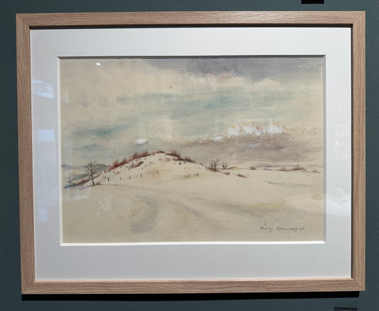 Traumhaftes Aquarell von Ruth Dolmetsch (1918-2000) „Im Winter“ aus dem Friedensjahr 1945. 30x42 cm, montiert und gerahmt.