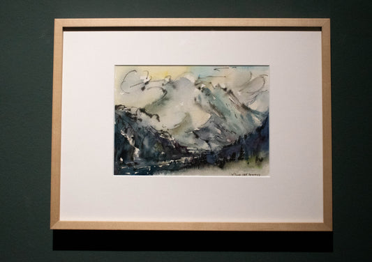 Alpines Aquarell von Wilhelm Raab (1907-1989) „Vorarlberg“, 1985, Österreich. Plein-Air Aquarell und Tusche auf Bütten, 18x24 / 30x40 cm, im hochwertigen Halbe-Rahmen hinter Artglass 92