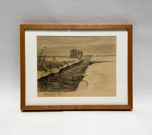 Graphitzeichnung Niederrheinische Flusslandschaft im Winter, signiert Reinhold, datiert (19)42.