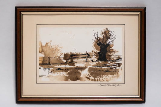 Jens Rusch (*1950) Kopfweide mit Zaun 1976 - Aquarell in Sepia, 70s Art