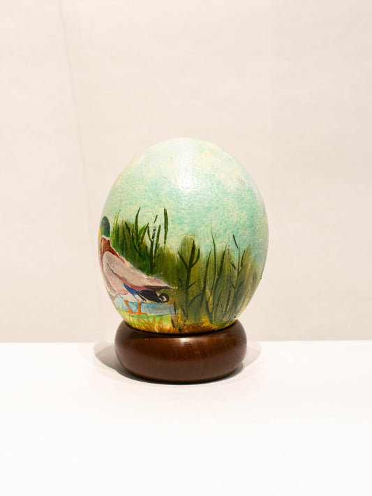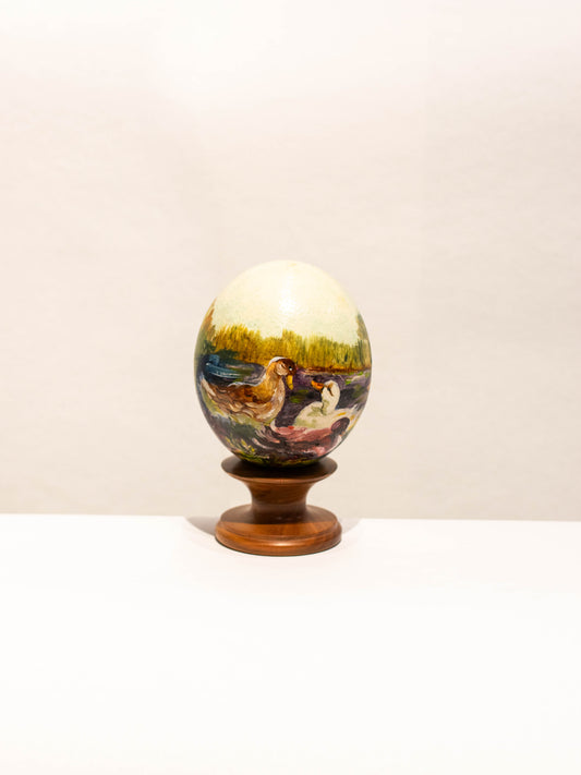 Handbemaltes Straußenei mit weißen Enten und Erpel, auf Holzsockel, Kurt Wicha (*1940), Mendig