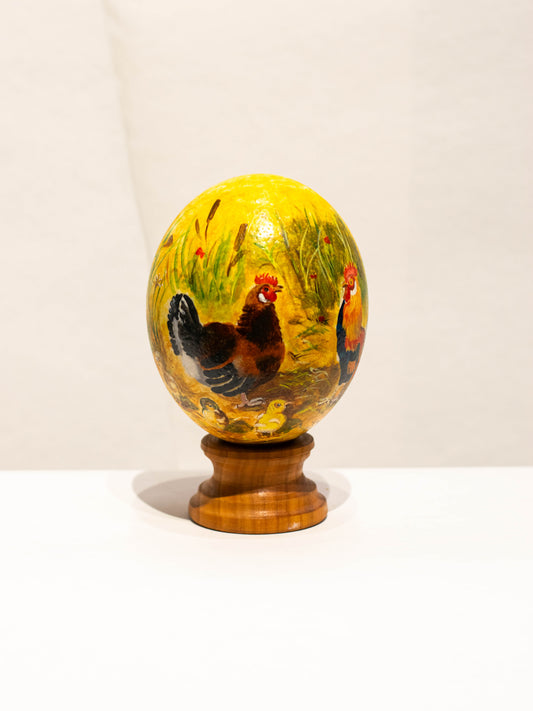 Handbemaltes Straußenei mit Huhn und Hahn sowie Entenpaar, auf Holzsockel, Kurt Wicha (*1940), Mendig
