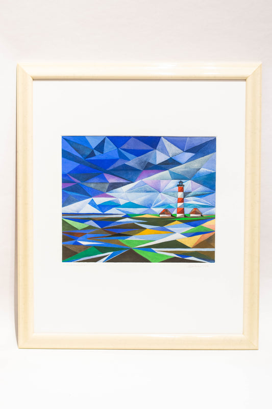 Mischtechnik auf Papier „Leuchtturm Westerheversand“ von Fred Bandekow (1934-2016), Nordfriesland Kubismus 1990