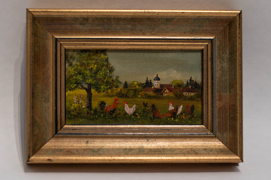 Kleines Gemälde Dorfidyll mit Hahn und Hühnern, Rosemarie Knieper Ottobrunn