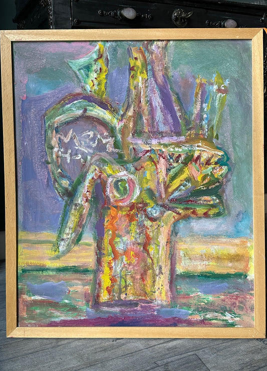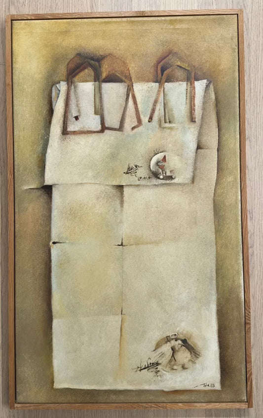 Orig. Gemälde Johannes Wolf (1939-2002 Siegburg) Öl a. Lw. „Das Amtsblatt“ 1985 Surrealismus X Kubismus X Symbolismus @ Öff. Verwaltung