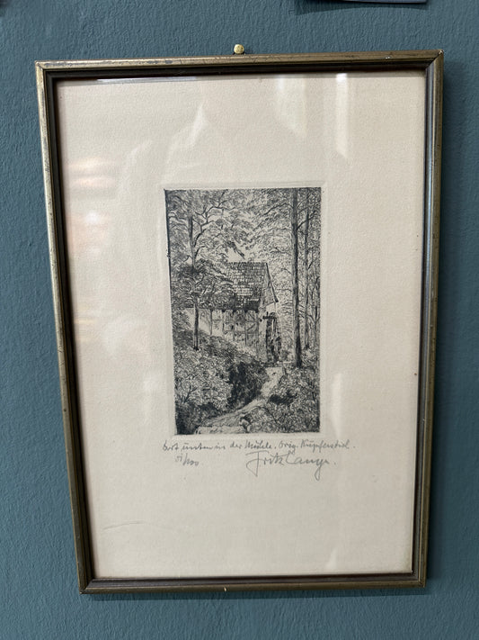 Orig.-Kupferstich v. Fritz Lange (1851-1922), Düsseldorf. Mühle in Fachwerkhaus an Bach im Wald