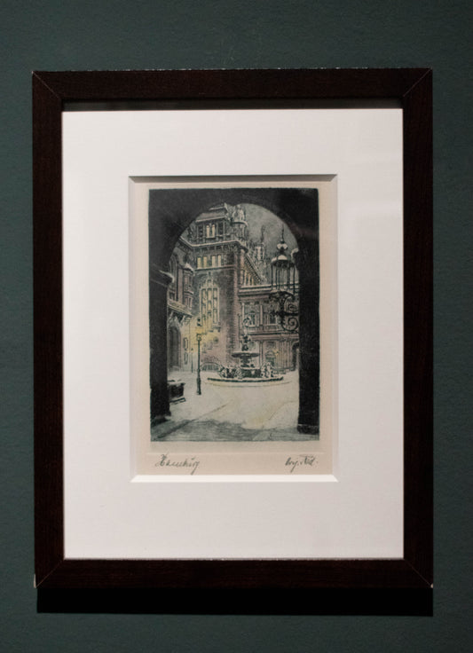Orig.-Farbradierung Hamburg, Blick durch einen Torbogen auf den Hygieia-Brunnen im Innenhof des Hamburger Rathauses, Künstler des 20. Jahrhunderts.
