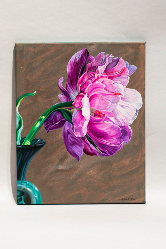 „Tulpe“ - Originalgemälde von Wolfgang Eberhardt (*1949) Öl auf Leinwand, Tulpe Double in blau-grüner Vase.