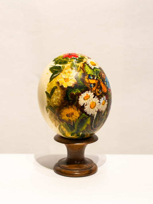 Handbemaltes Straußenei mit Margeriten und Schmetterling, auf Holzsockel, Kurt Wicha (*1940), Mendig