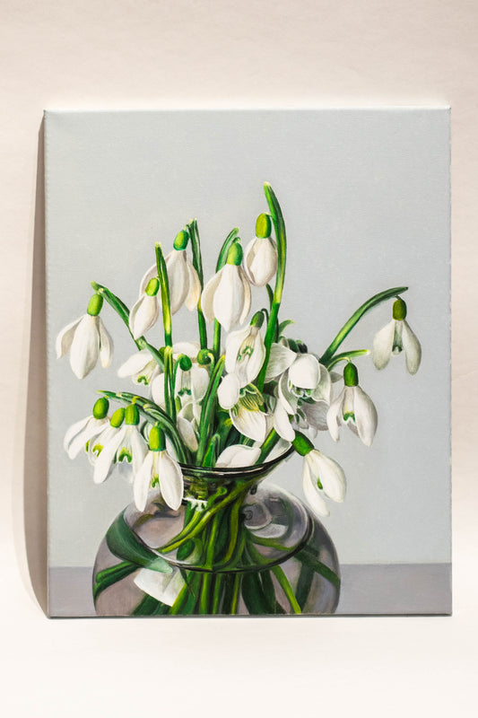 Zarte Schneeglöckchen in Rauchglasvase - Eindrucksvolles Stillleben-Gemälde von Wolfgang Eberhardt (*1949) aus Münstermaifeld. Hyperrealistische Malerei at its best
