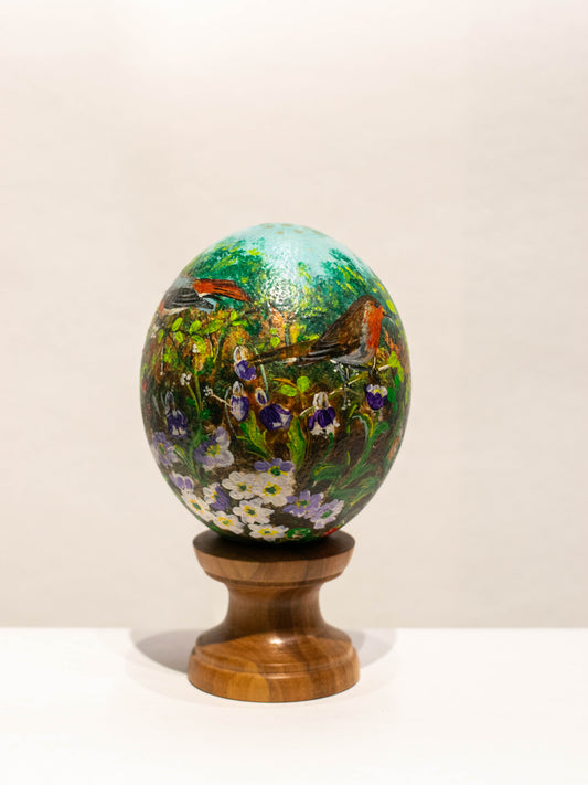 Handbemaltes Straußenei mit Gartenvögeln, u.a. Rotkehlchen, auf Holzsockel, Kurt Wicha (*1940), Mendig