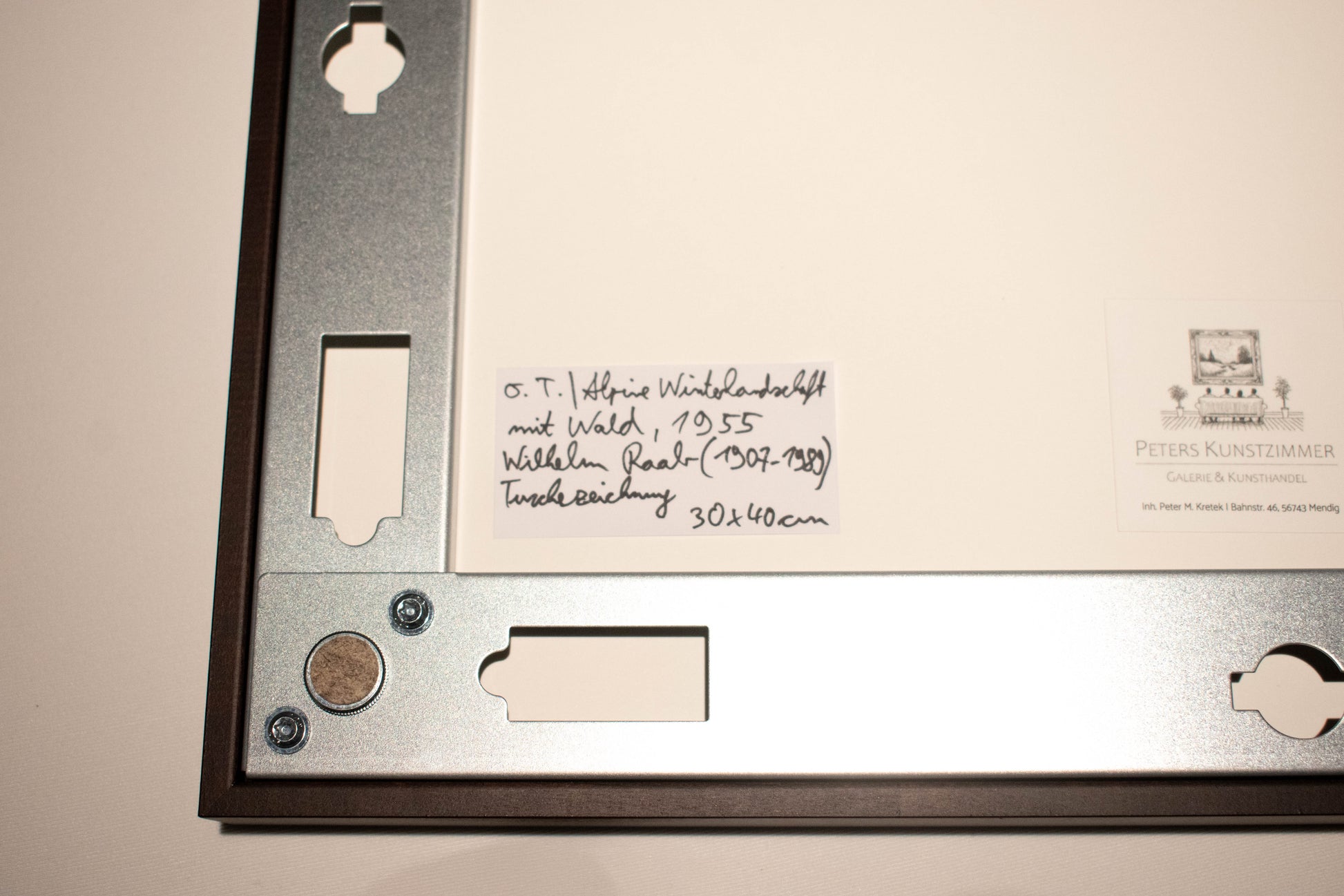 Alpine Winterlandschaft mit Nadelwald, Tusche auf Papier von Wilhelm Raab (1907-1989), 1955, 30x40 Conservo Holz Halbe-Rahmen mit Artglass 92 verglast