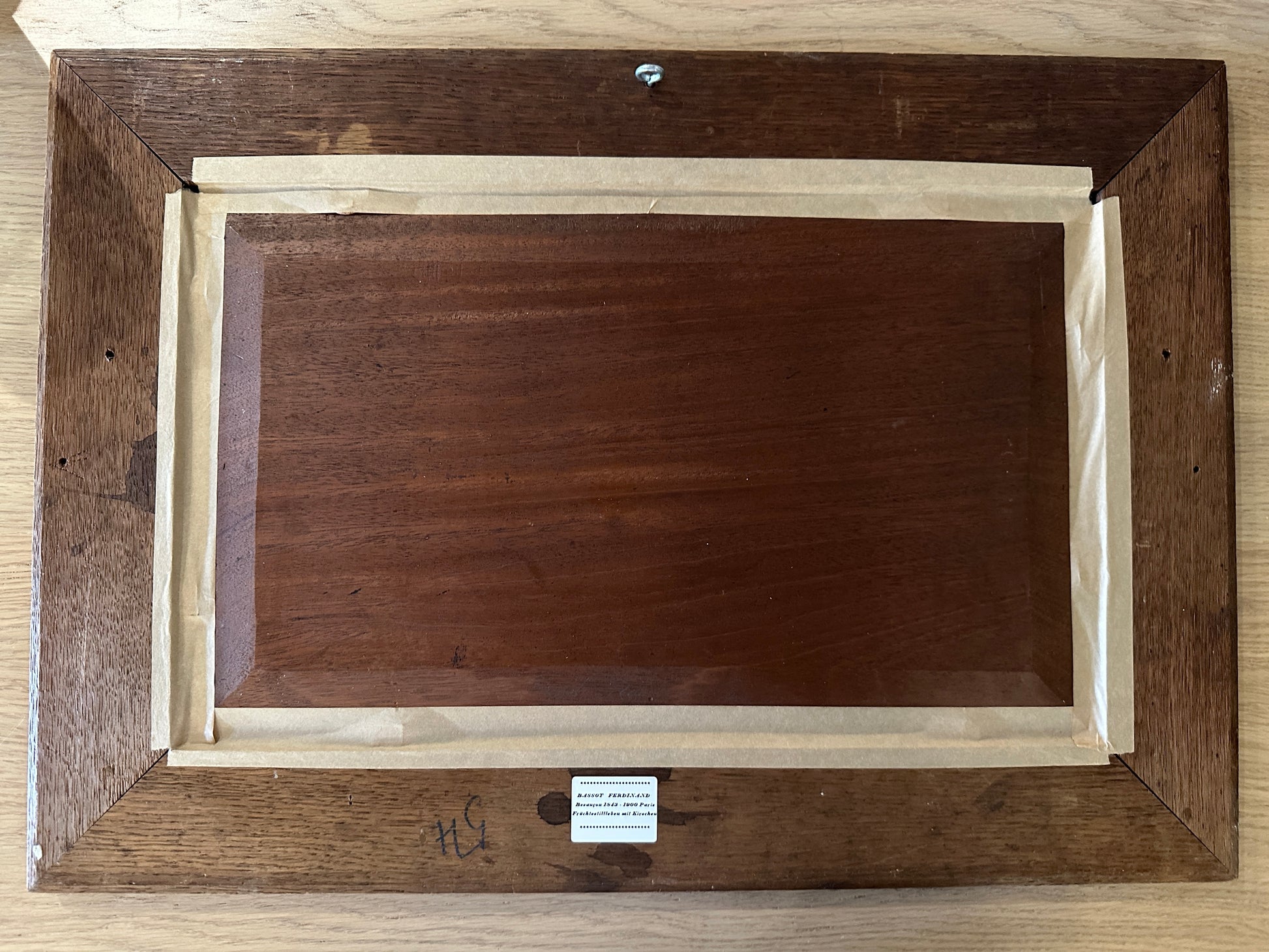 Zustand: sehr gut, minimale Retuschen im Bild, Holzrahmen mit minimalen Blessuren und Kerben oben und rechts unten.